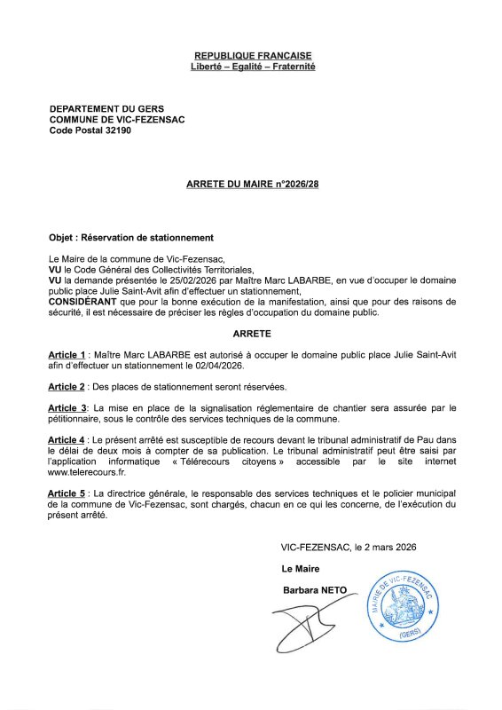02-03-2026 - Arrêté n°2026/28 - Réservation de stationnement (place Julie Saint Avit)