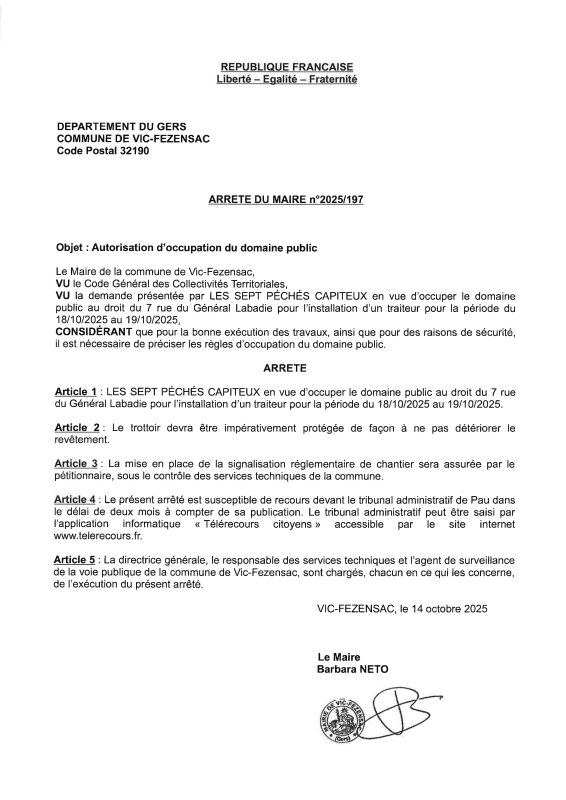 14-10-2025 - Arrêté n°2025/197 - Occupation du domaine public (rue du Général Labadie)