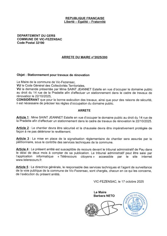 17-10-2025 - Arrêté n°2025/200 - Stationnement pour travaux de rénovation ( rue de la Pradette)