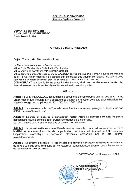 12-11-2025 - Arrêté n°2025/220 - Travaux de réfection de toiture (rue Victor Hugo et rue Thouade)