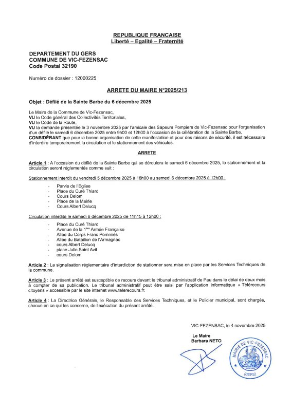 04-11-2025 - Arrêté n°2025/213 - Défilé de la Sainte Barbe 2025