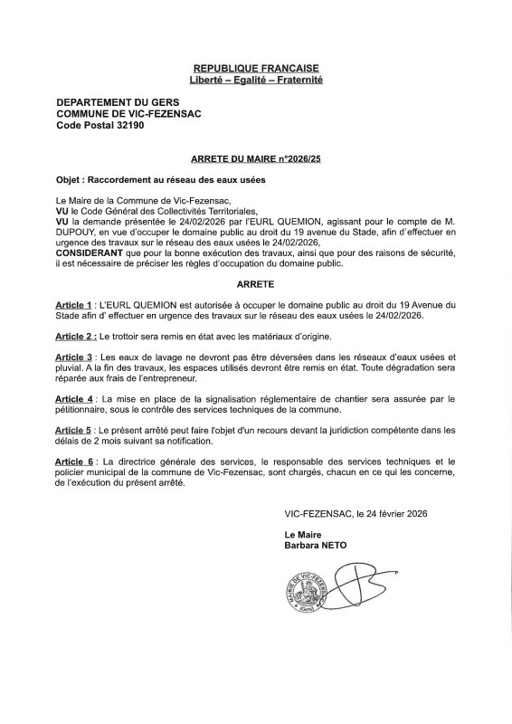 24-02-2026 - Arrêté n°2026/25 - Travaux sur réseaux des eaux usées (Avenue du Stade)