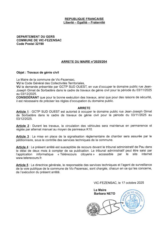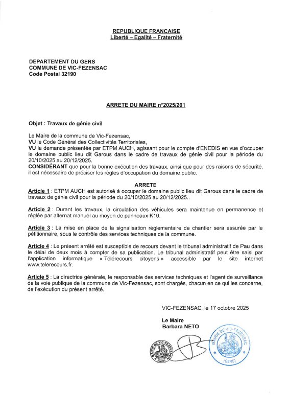 17-10-2025 - Arrêté n°2025/201 Travaux de génie civil (Garous)