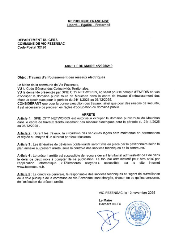 10-11-2025 - Arrêté n°2025/219 - Travaux d'enfouissement des réseaux électriques (route de Mouchan)