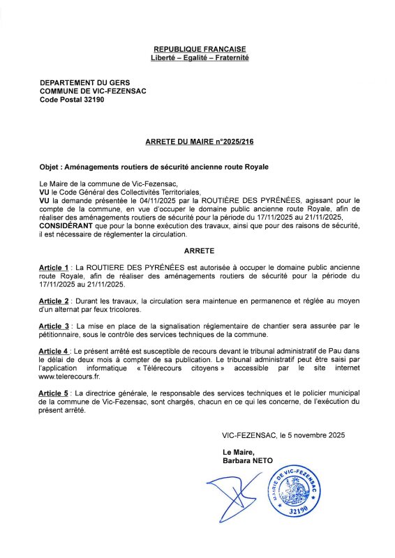 05-11-2025 - Arrêté n°2025/216 - Aménagements routiers de sécurité (Ancienne Route Royale)