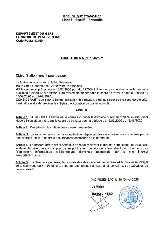 16-02-2026 - Arrêté n°2026/21 - Stationnement pour travaux (rue Victor Hugo)