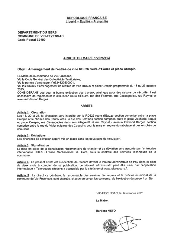 14-10-2025 - Arrêté n°2025/194 - Travaux d'aménagement de la route d'Eauze et place Crespin