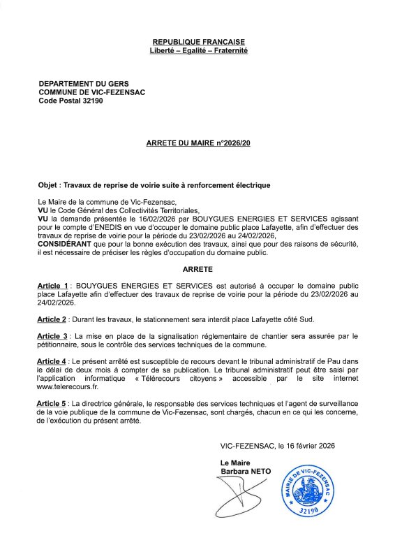 16-02-2026 - Arrêté n02026/20 - Travaux de reprise de voirie (place Lafayette)