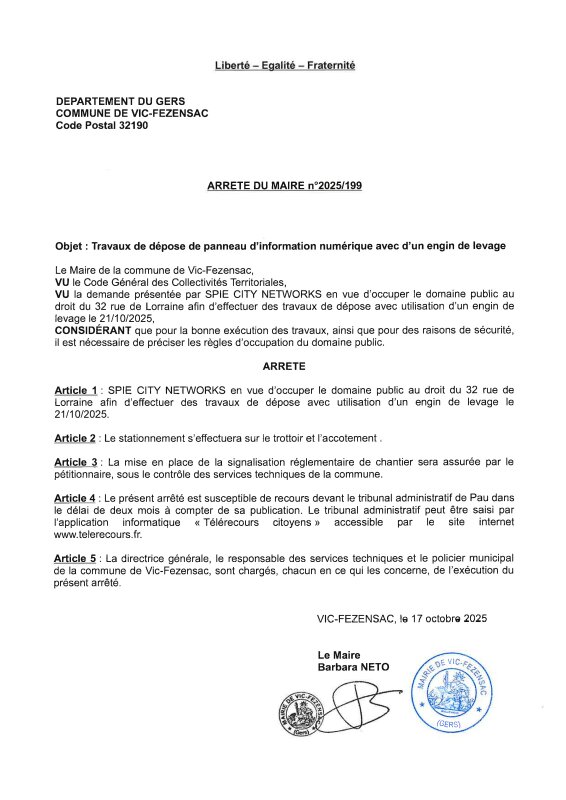 17-10-2025 Arrêté n°2025/199 - Travaux de dépose de panneau d'information (rue de Lorraine)