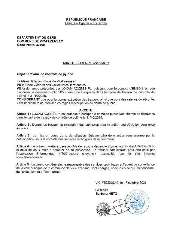 17-10-2025 - Arrêté n°2025/202 - Travaux de contrôle de pylône (chemin de Broquens)