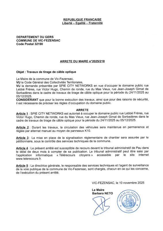 10-11-2025 - Arrêté n°2025/218 - Travaux de tirage de câble optique (diverses voies communales)