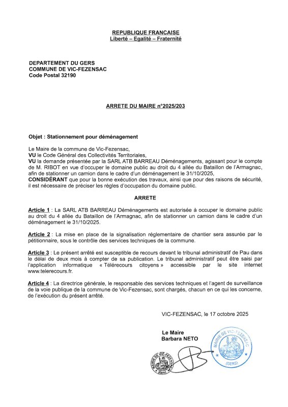 17-10-2025 - Arrêté n°2025/203 - Stationnement pour déménagement (allée du Bataillon de l'Armagnac)