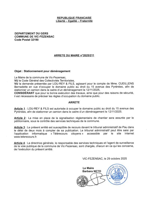 29-10-2025 - Arrêté n°2025/211 - Stationnement pour déménagement (avenue des Pyrénées)