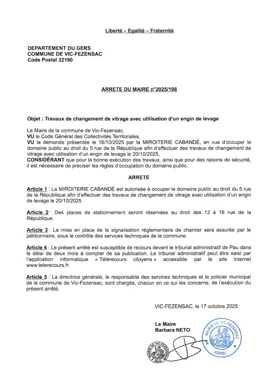 17-10-2025 - Arrêté n°2025/198 - Travaux de changement de vitrage (rue de la République)