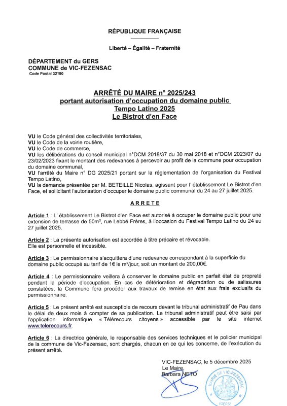 05-12-2025 - Arrêté n°2025/243 - Occupation du domaine public TEMPO LATINO