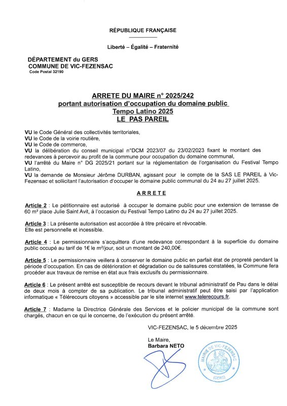 05-12-2025 - Arrêté n°2025/242 - Occupation du domaine public TEMPO LATINO
